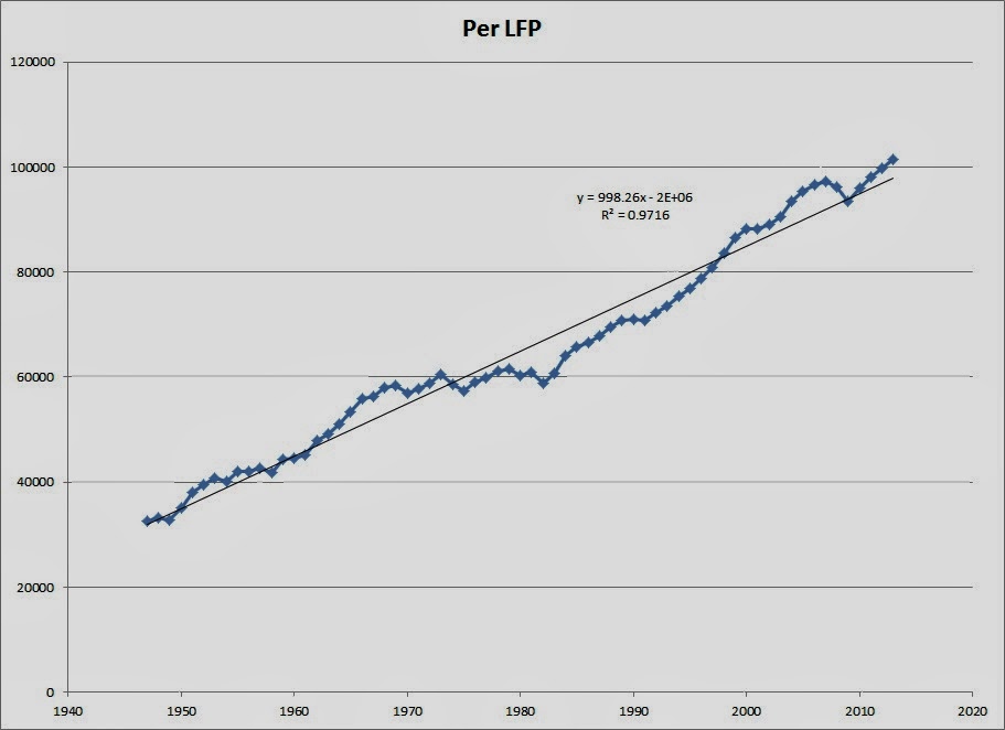 This is adjusted for inflation (using 2009 dollars). The second graph is GDP divided by number of people in the labor force (that starts in 1947 since that is when we started using age 16 and older). The third graph is GDP divided by the number of people with jobs. The fourth graph is GDP per capita from 1947-2013.